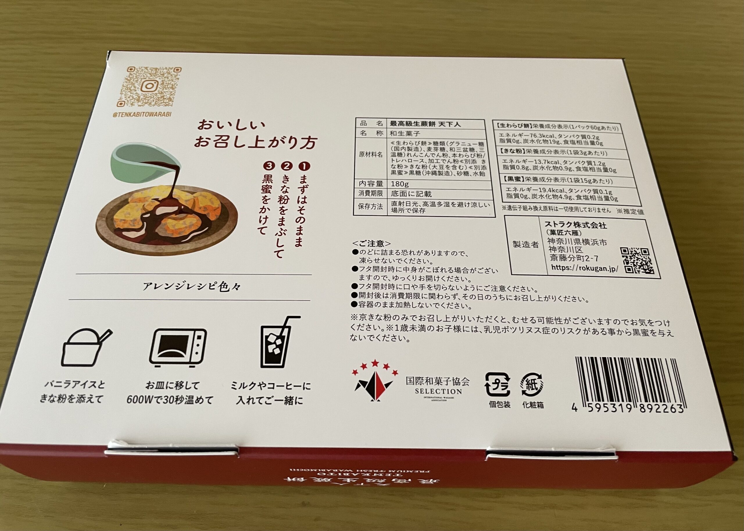 個包装わらび餅3つ(約180g)に、きなこと黒蜜2袋ずつを同梱した商品となります。
