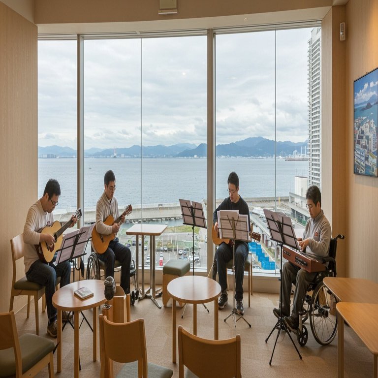 海が見える立地、楽器が弾けるカフェ、障害者の方が活躍する場、という3つの条件で生成してもらったところ、良い感じのものが出来上がりました。