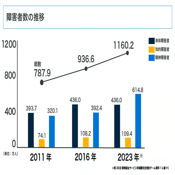 内閣府によると、令和5年度の時点で、身体障害者436万人、知的障害者109万4000人、精神障害者614万8000人と、年々、その数は増え続けています。