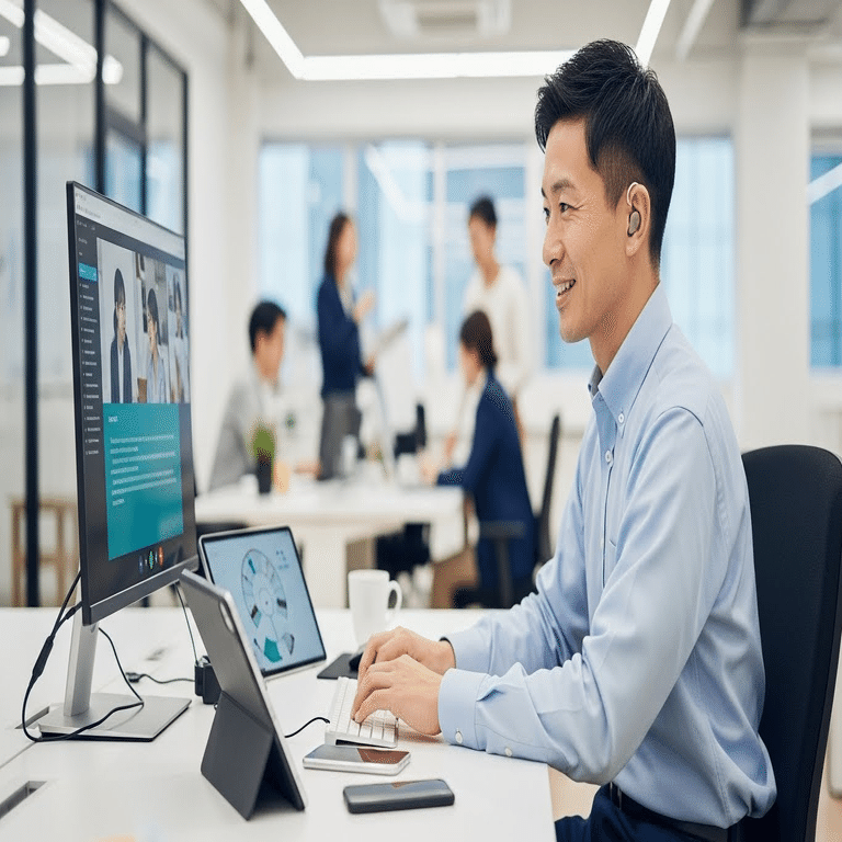 聴覚障害のある方には、音声をリアルタイムで文字化する「UDトーク」やMicrosoft Teamsの字幕機能が有効です。