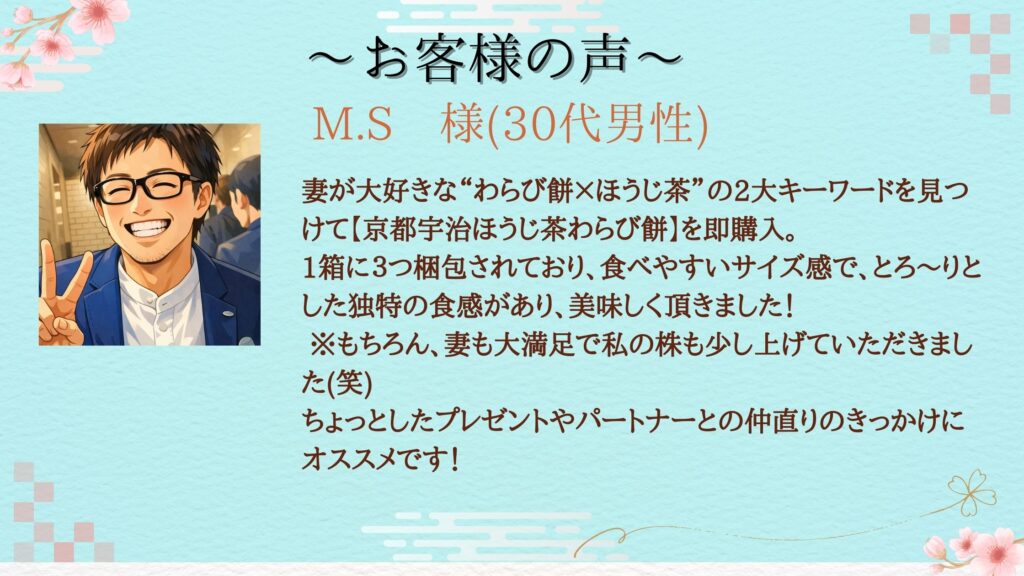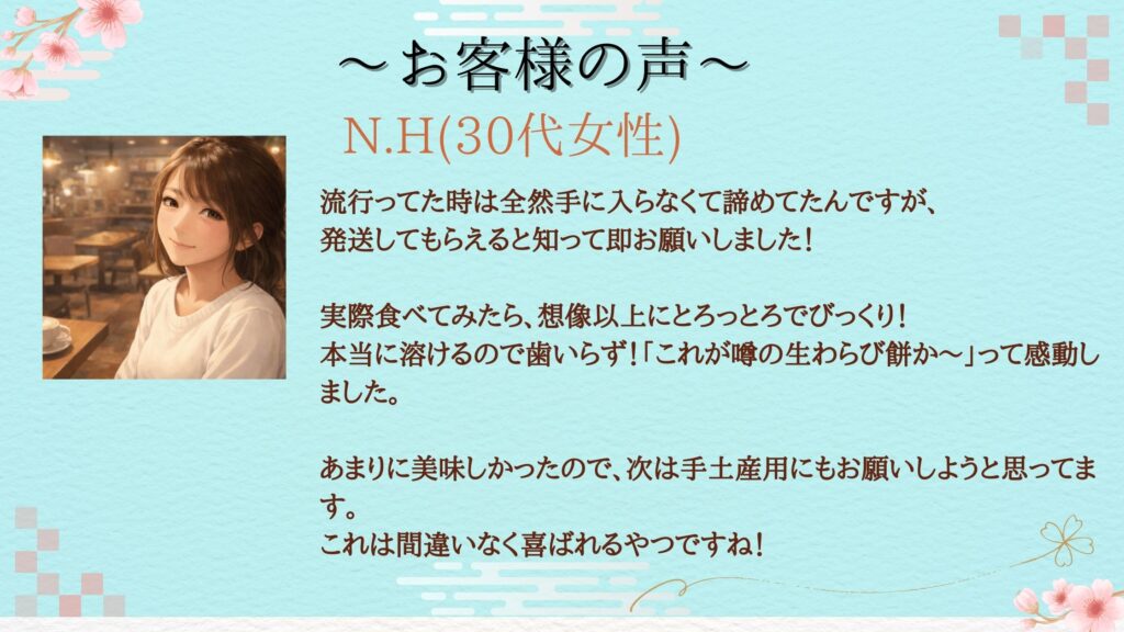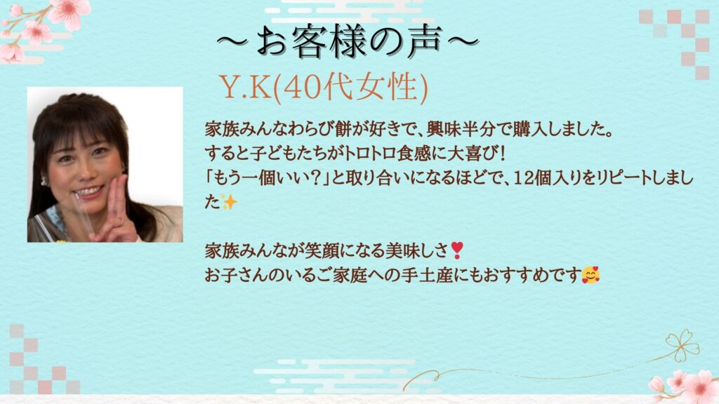 当店で、わらび餅をご購入頂いたお客様のご感想を、一部ご紹介いたします。